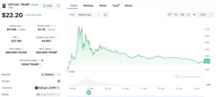 Просто за 2 дні монета піднялася до 75 доларів, досягнувши ринкової капіталізації в 15 мільярдів доларів. Навіть зараз, тобто, коли вона дещо відступила від своїх піков, $TRUMP знаходиться серед топ-5 криптовалют у світі, що стосується ринкової капіталізації.