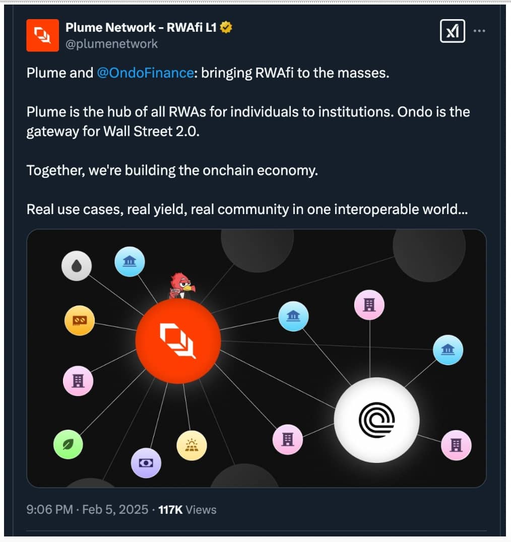 На прикладі Ondo Finance цей проект у лютому послідовно запустив інноваційні продукти, такі як Ondo Chain та Ondo Global Markets, що активно сприяють токенізації RWA.