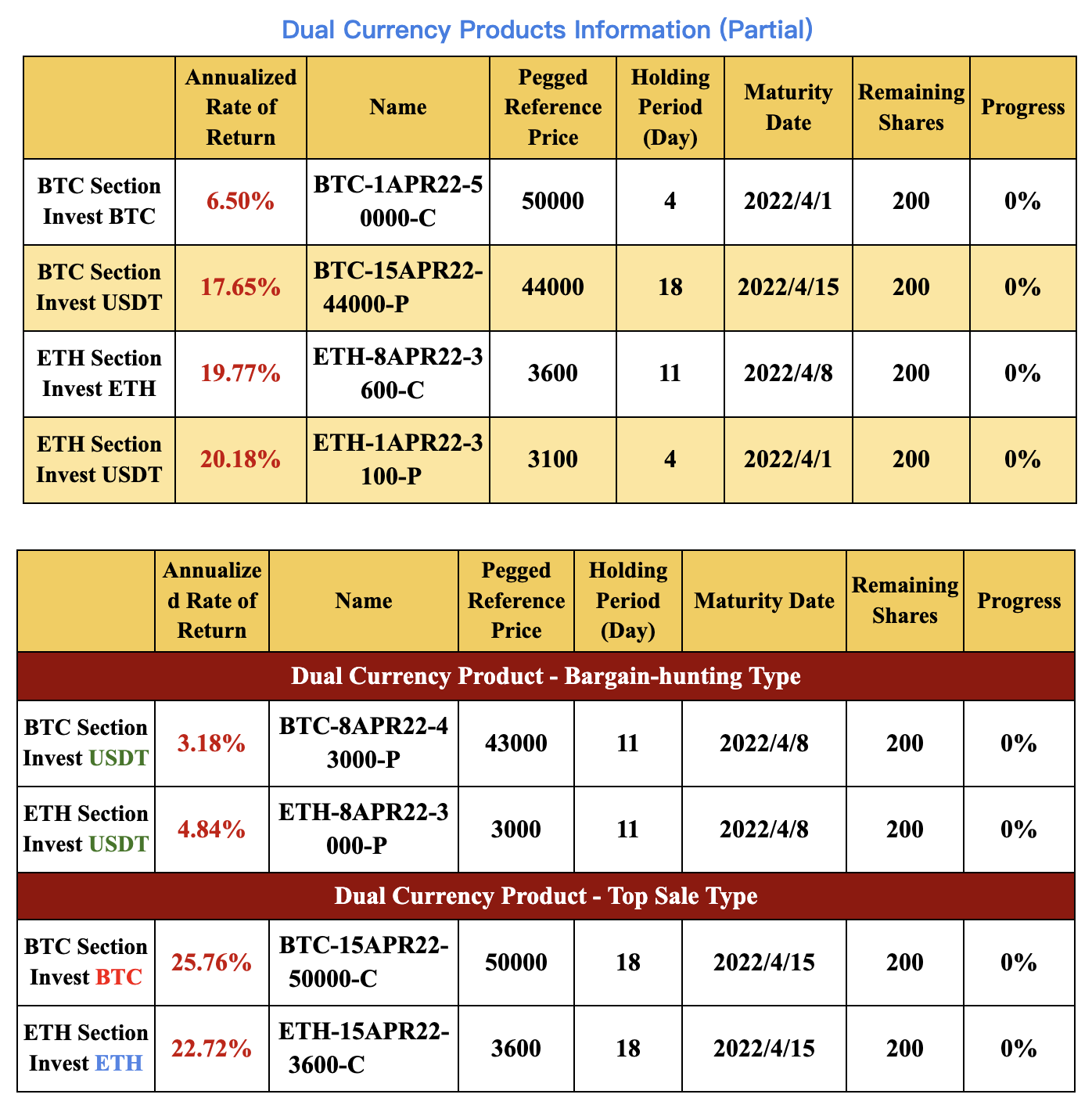 Dual Currency Products on Gate Finance now include BTC/USDT and ETH/USDT dual financial products. In the BTC section, the new products will have 4 to 18 holding days with pegged reference prices ranging from $43,000 to $50,000. BTC or USDT will be the final settlement currency at maturity for principal and earnings. As for the ETH section, new products will have 4 to 18 holding days with pegged reference prices ranging from $3,000 to $3,600. ETH or USDT will be the final settlement currency at maturity for principal and earnings.