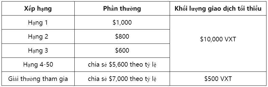 Tất cả người dùng đủ điều kiện dựa trên khối lượng giao dịch sẽ chia sẻ phần thưởng $15,000 VXT.