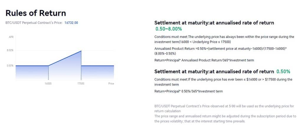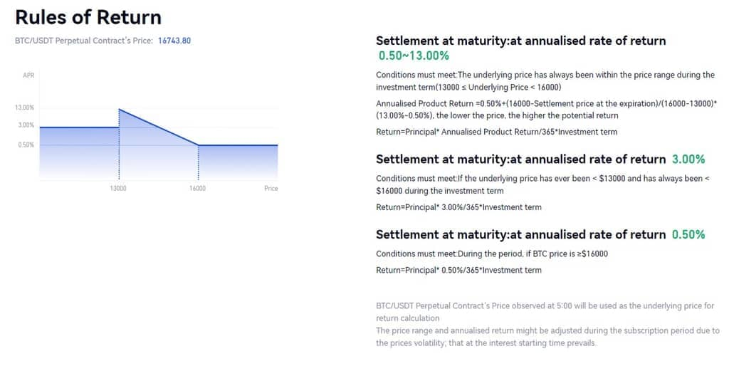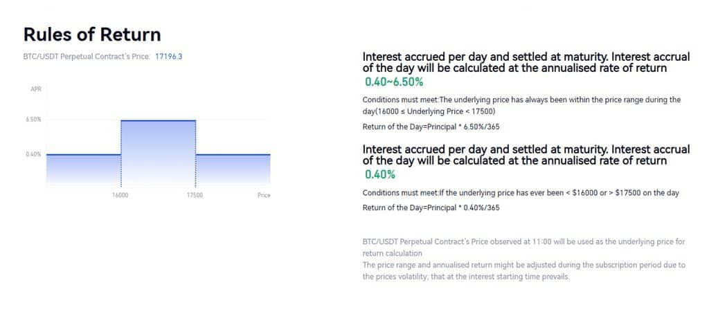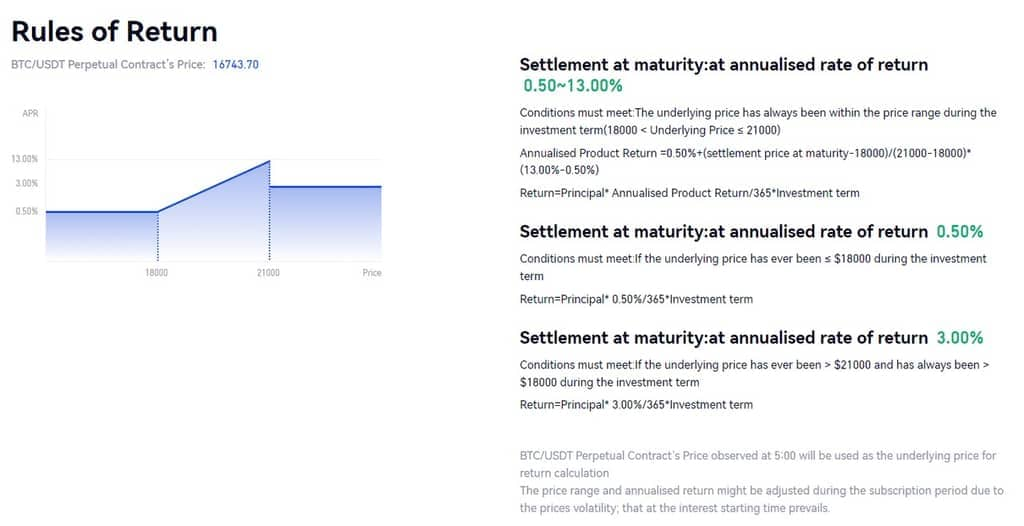 Trong thời gian quan sát, nếu giá của tài sản mục tiêu nằm trong phạm vi giá được chỉ định, nhà đầu tư có thể kiếm được lợi nhuận hàng năm cao hơn. Khi thanh toán, giá tài sản mục tiêu càng gần với giới hạn trên của phạm vi giá thì lợi nhuận hàng năm càng cao.