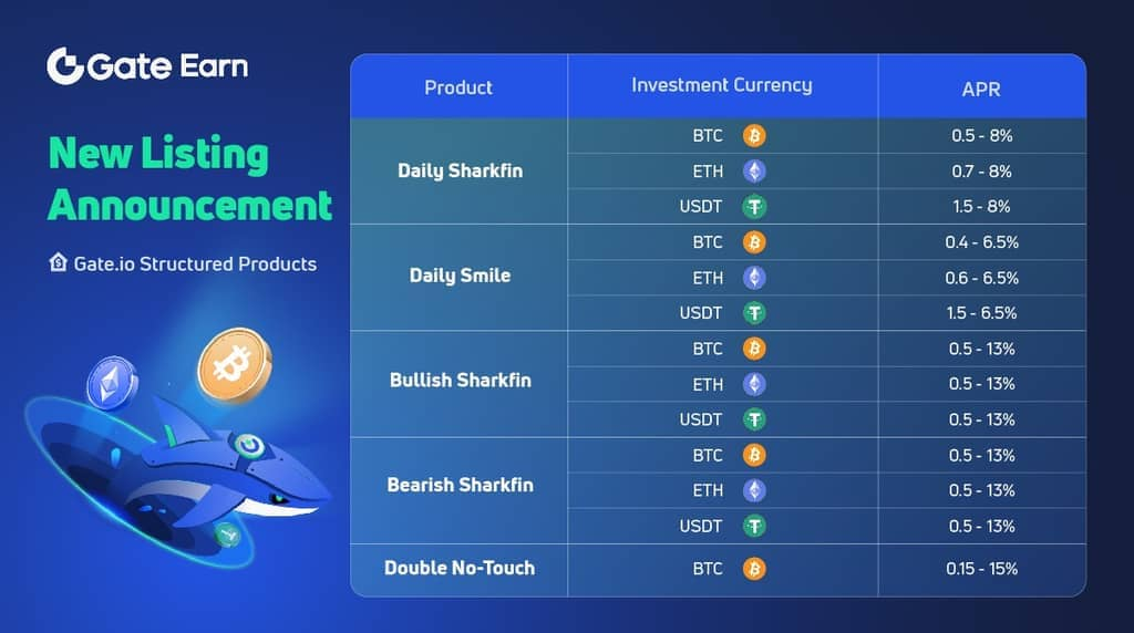 Gate đã ra mắt [Daily SharkFin], [Double No-touch], [DailySmile], [Bullish SharkFin] và [Bearish SharkFin], bao gồm BTC & USDT & ETH và các sản phẩm khác. Là một sản phẩm quản lý tài chính được đảm bảo bằng vốn, các sản phẩm có cấu trúc của Gate cung cấp cho người dùng lợi nhuận hàng năm lên tới 15%. Đăng ký sẽ bắt đầu lúc 17:00 (UTC+7) ngày 5 tháng 6 năm 2023. Mọi người đều được hoan nghênh tham gia!