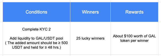 Người dùng có thể thêm thanh khoản vào nhóm GAL / USDT theo yêu cầu trong bảng sau và điền vào biểu mẫu. Sau khi hoạt động kết thúc, 25 người may mắn đủ điều kiện sẽ được rút thăm từ tất cả những người tham gia đã điền thông tin vào biểu mẫu.