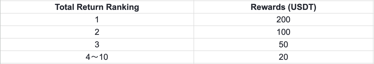 5.Reward 3 requires the Top 10 users in return to have a total return of at least 3,000,000 USDT, otherwise, actual rewards will be reduced based on actual total return.