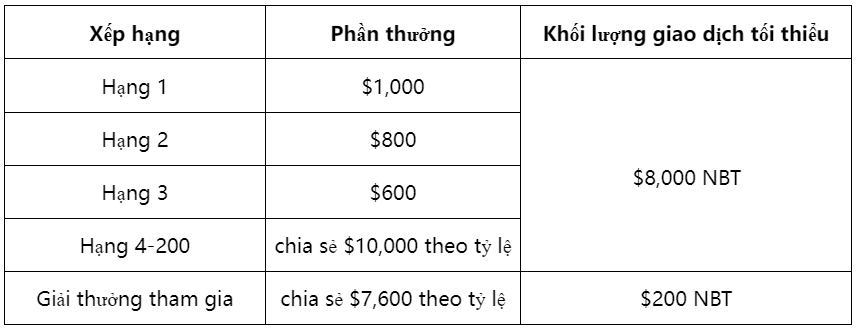 Tất cả người dùng đủ điều kiện dựa trên khối lượng giao dịch sẽ chia sẻ $20,000 NBT.