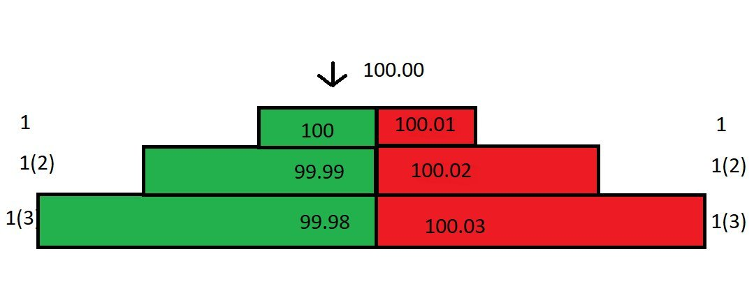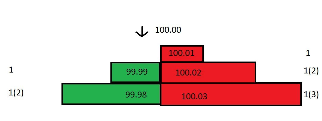 Dù chênh lệch giữa giá mua tốt nhất (100) và giá bán tốt nhất (100,01) chỉ là 0,01, lợi nhuận thực tế bạn nhận được lại là 0,03!