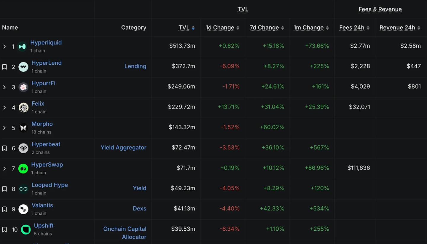 Tính đến ngày 31 tháng 5 năm 2025, dữ liệu trên DefiLIama cho thấy hệ sinh thái HyperEVM có TVL là 1,8 tỷ đô la, bao gồm cho vay, DEX, meme và các kênh khác.