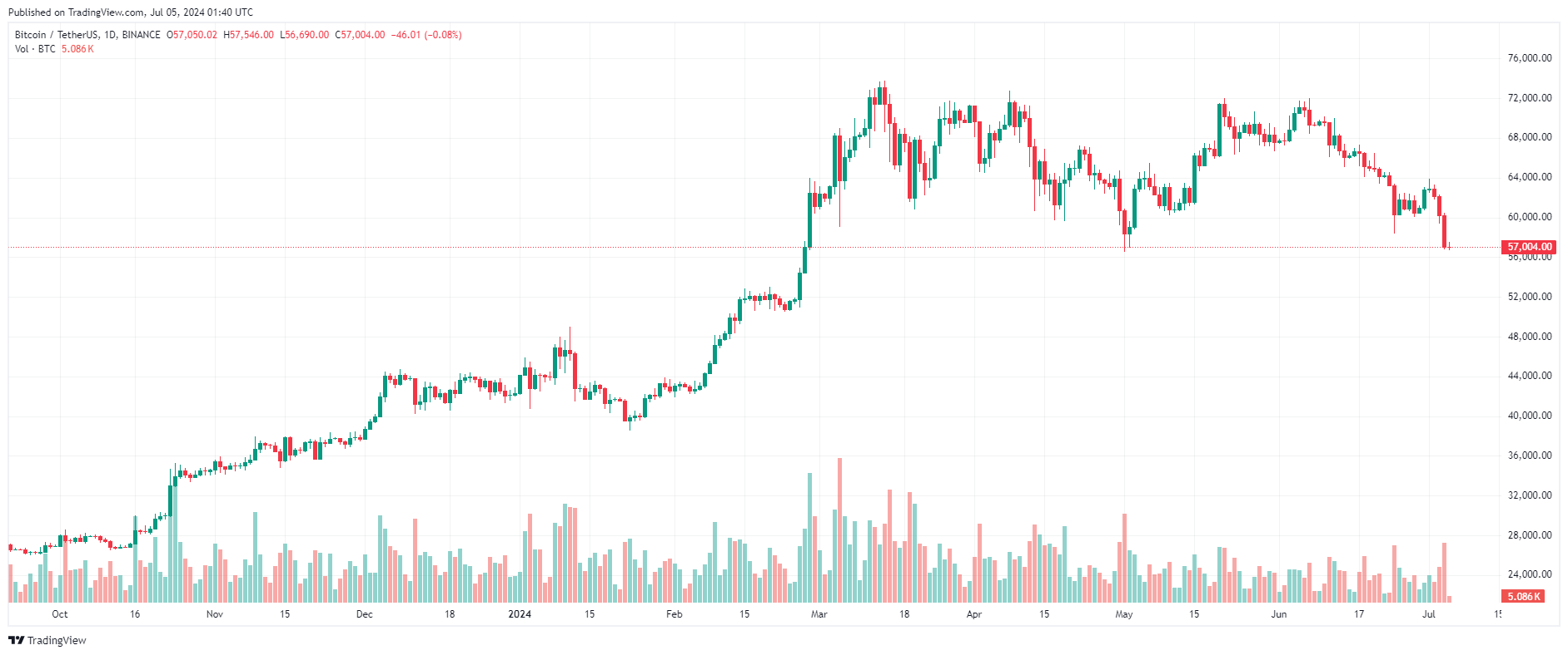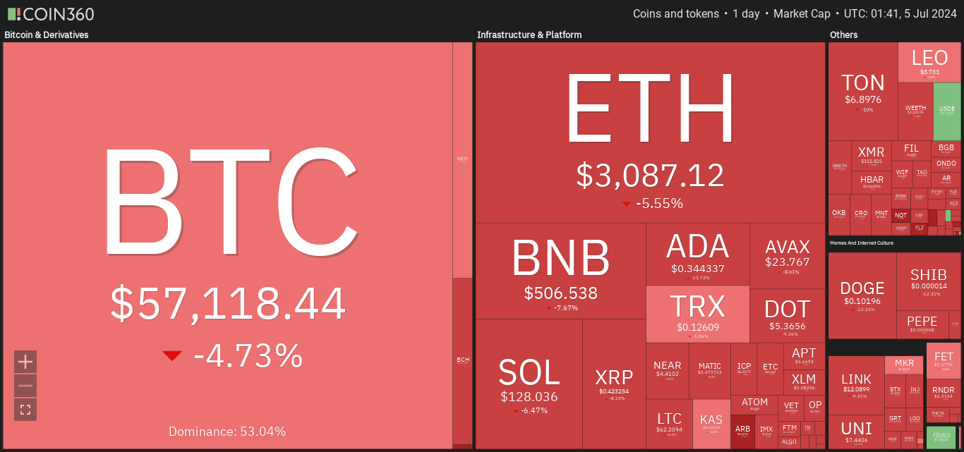 Giá Coin hôm nay 05/07: Bitcoin lao dốc về $ 57.000, altcoin rực lửa khi chứng khoán Mỹ gần như đi ngang
