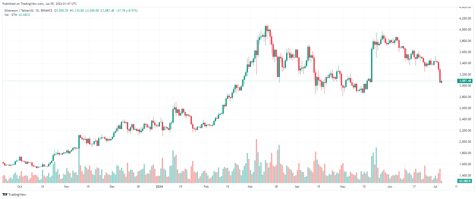 Hiện tại, tài sản có vốn hóa lớn thứ 2 trên thị trường đang được giao dịch ngay bên dưới $3.100, mất hơn 4% giá trị so với 24 giờ trước đó.