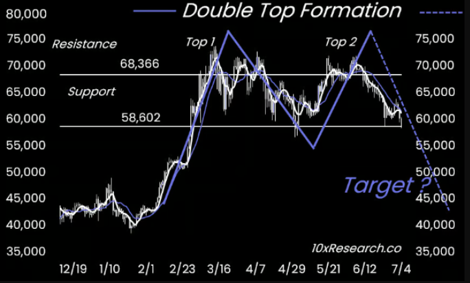 Biểu đồ phân tích báo cáo nghiên cứu của 10x Research mô tả BTC hình thành “mô hình hai đỉnh” kể từ tháng 12/2023 | Nguồn: 10x Research