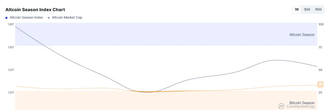 Theo một chỉ số mùa altcoin lớn, chỉ số hiện tại là 31, dần dần tăng từ 26 hôm qua và 35 tuần trước. Chỉ số này vẫn nằm trong phạm vi thống trị của Bitcoin, nhưng sự gia tăng ổn định của nó gợi ý rằng tâm lý có thể đang thay đổi. Lịch sử cho thấy, các chỉ số trên 75 cho thấy altcoin đang vượt trội hơn Bitcoin, đánh dấu sự khởi đầu của cái mà các nhà giao dịch gọi là “mùa altcoin.”