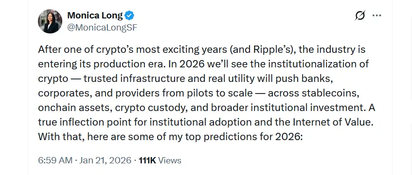 Nguồn: CryptoNewsNet Tiêu đề gốc: Crypto sẽ chiếm 50% trong Fortune 500 vào năm 2026: Chủ tịch Ripple Liên kết gốc: https://cryptonews.net/news/finance/32309644/ Khoảng 250 trong số các tập đoàn lớn nhất của Mỹ sẽ nắm giữ tiền điện tử hoặc sử dụng các công cụ tài chính dựa trên blockchain vào cuối năm 2026, theo lời của chủ tịch Ripple Monica Long.