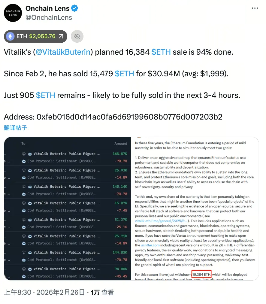 Vào ngày 26 tháng 2 năm 2026, Onchain Lens, một cơ quan giám sát dữ liệu trên chuỗi, tiết lộ rằng kế hoạch bán 16.384 ETH từ địa chỉ liên kết của người đồng sáng lập Ethereum Vitalik Buterin đã được hoàn thành 94%, với áp lực bán còn lại chưa đến 10 triệu đô la. Việc tái cấu trúc tài sản minh bạch này, bắt đầu từ đầu năm, không chỉ ảnh hưởng đến thần kinh thị trường mà còn trở thành một mẫu quan trọng để quan sát hành vi của các nhân vật chủ chốt trong ngành công nghiệp tiền điện tử và khả năng tiêu hóa thị trường. Bài viết này sẽ phân tích từ nhiều khía cạnh như dữ liệu trên chuỗi, sự khác biệt về dư luận và ảnh hưởng của ngành, khôi phục bức tranh toàn cảnh của sự kiện và suy ra sự phát triển tiếp theo.