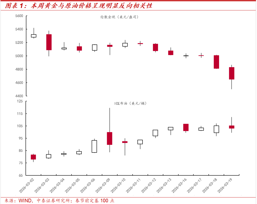 Mặt khác, mối tương quan nghịch đảo giữa giá vàng và dầu thô trong thời gian gần đây tăng mạnh, kim loại quý giảm mạnh trong tuần này. Thứ Tư và thứ Năm, giá dầu tăng nhanh, trong khi giá kim loại quý giảm mạnh cùng thời điểm. Hai loại tài sản lớn toàn cầu thể hiện rõ mối tương quan tiêu cực, điều này trái với logic định giá vàng bình thường: Thông thường, giá dầu tăng sẽ qua hai kênh thúc đẩy vàng: một là do xung đột gia tăng làm tăng nhu cầu trú ẩn; hai là giá năng lượng tăng đẩy kỳ vọng lạm phát, từ đó nâng cao giá trị chống lạm phát của vàng. Do đó, giá dầu và vàng thường có mối quan hệ cùng chiều nhất định, đặc biệt khi kỳ vọng lạm phát tăng, nhu cầu đầu tư vàng sẽ tăng.