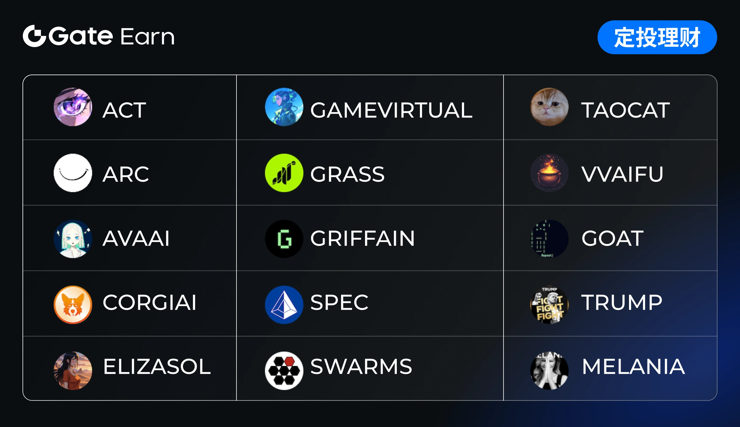 Gate 定投理财现已支持 AI Agent 板块代币、 TRUMP 与 MELANIA,共新增 15 种热门代币。在瞬息万变的加密市场中,稳健的投资策略尤为重要,Gate 定投理财让您能够更灵活地进行理财,实现资产的长期增值。