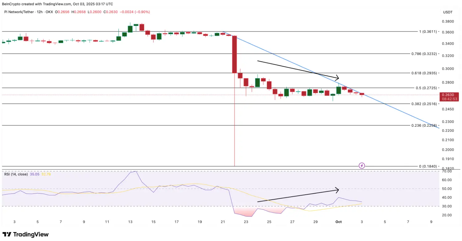 12小時圖表正發出對Pi Coin非常不利的信號。這種幣呈現出下降三角形的模式——一種典型的“下跌”技術結構,價格持續形成低點,但仍然在同一支撐區域徘徊。市場動量也不太樂觀。
