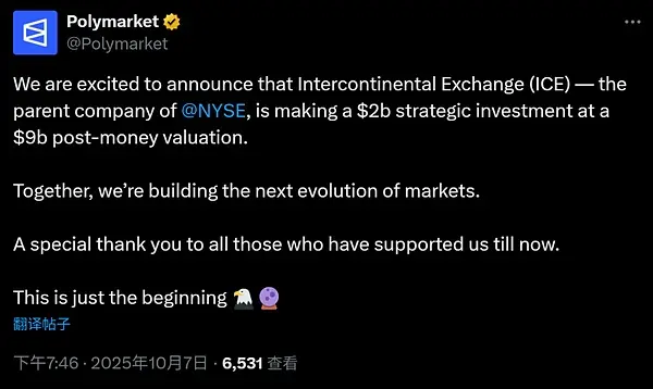 2025 年 10 月 7 日,預測市場 Polymarket 官宣紐約證券交易所母公司洲際交易所(ICE)將對其進行 20 億美元的戰略投資,投後估值高達 90 億美元,這不僅是近年來 Web3 領域項目獲得的最高融資額之一,更將預測市場的潛力與熱度推至舞臺中央。