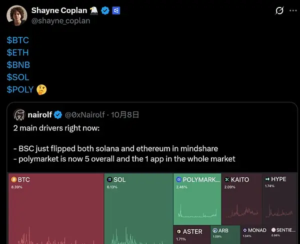 這也很可能和最新的 20 億美元巨額融資是一個組合拳,且 Polymarket 首席執行官 Shayne Coplan 在 10 月 9 日也發布帶有 POLY 符號的推文,可能成爲兩雄競爭的關鍵變量。