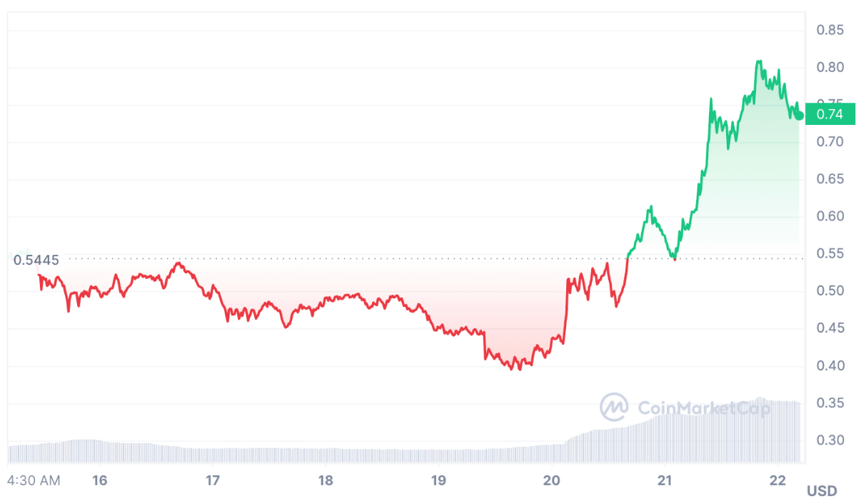 ⭐️本週內市場行情持續走低,給到了許多幣種較為明顯的打擊。雖然加密市場利多資訊不多,但聯準會一系列政策所帶來的影響,對美國基金市場有正向作用,這也在一定程度上帶動了專注於現實世界資產RWA代幣化業務的Ondo,雖然漲幅已無法同過往幾週的MEME版塊幣種漲勢相比較,但在當下的行情中一周仍有35.2%的漲幅,目前價格維持在0.7353美元附近。 ONDO的上漲走勢除了外部原因外,也同其發行週期較短有關,目前還處在發行初期,市場價格預期比較高也是其中的原因之一。