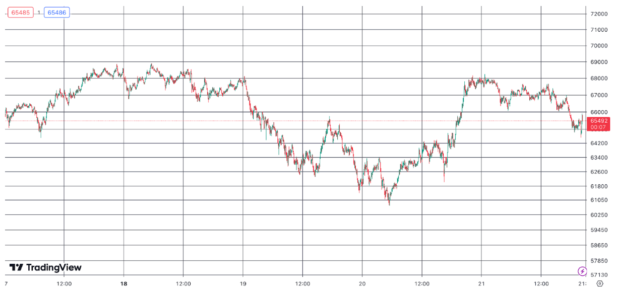 本週內BTC的價格走勢基本上以開盤後持續下跌,之後進入到幅度較大的劇烈震盪週期內。其價格在短時間內經歷了由69,000美元價位跌至6,1000美元價位的誇張降幅,單日跌幅最大超過8%。目前該幣種仍處在震盪週期中持續波動,日內漲跌幅度都比較大,預計會在周末收盤階段迎來較明確的走勢表現。