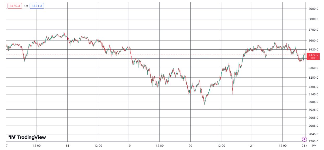 ETH在本週內的價格走勢與BTC持續保持強關聯特性,同樣是開盤便出現快速下跌行情,ETH的價格一路跌破3100美元,但目前已經有所回暖。一週大部分時間中ETH價格走勢相較於BTC來說要略微平緩一些,該幣種未出現跌破3000美元關鍵價位引發補跌的事件。目前基本維持在了3500美元上下持續波動,預計在周末收盤階段迎來一波回漲。