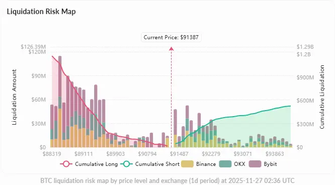清算風險圖顯示$89,000下方存在大量多頭清算壓力(累計約$1.07B),爲該位置提供強支撐。