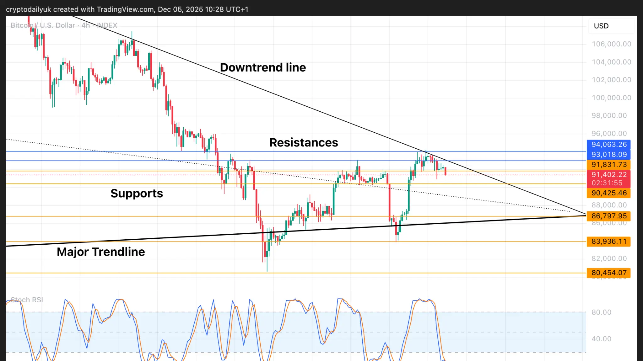 目前,在短期內,BTC 價格表現相對穩健。若當前的反轉跌至 $90,000 水平支撐或下降趨勢線,價格有可能從其中一個水準反彈。此時,突破的機率看起來高於跌破。