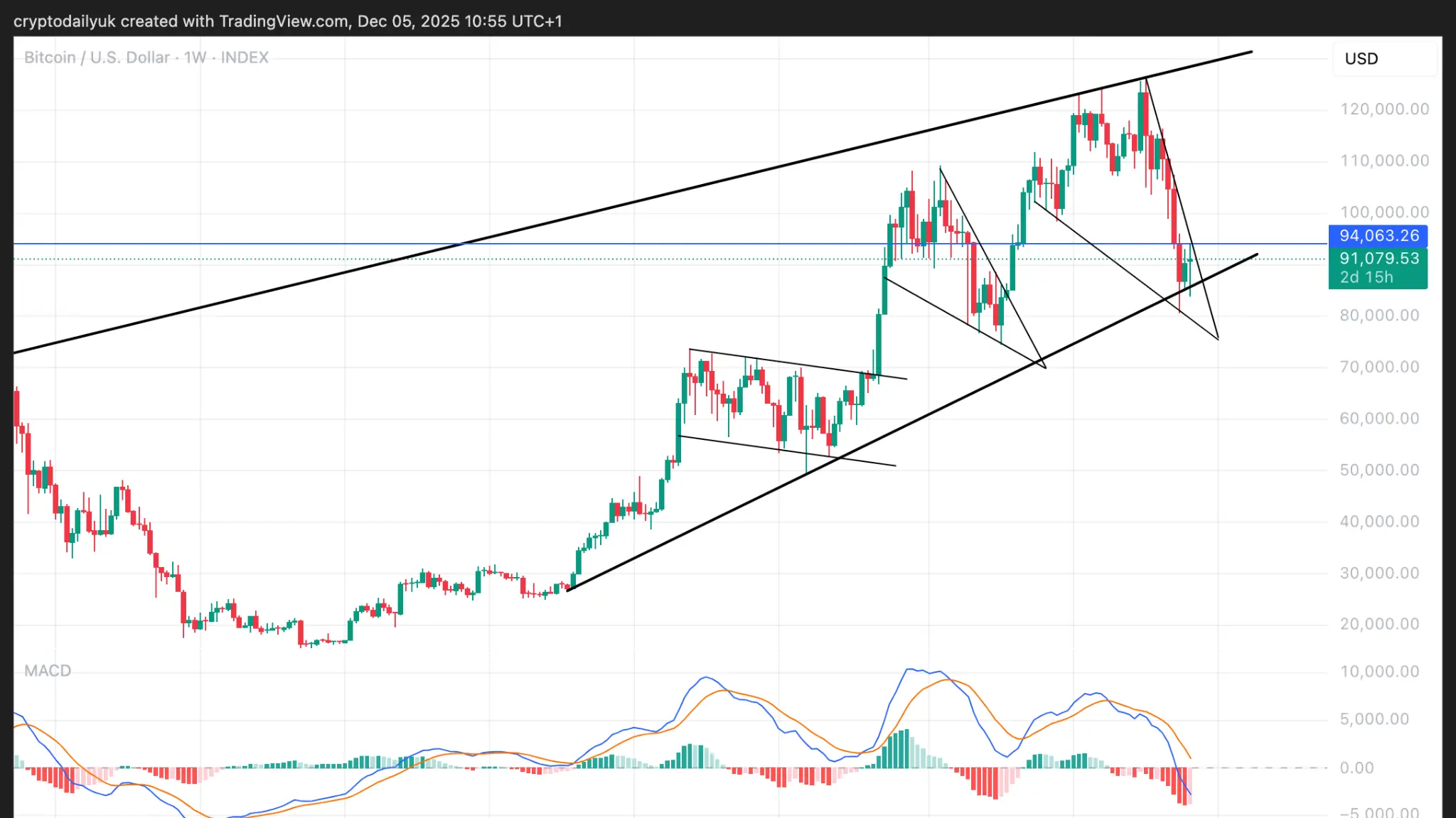 比特幣 (BTC) 價格正接近由下跌趨勢線和主要上升趨勢線所形成的楔形頂點。如果突破向上,多頭市場可能還有生機;若跌破,潛在的熊市可能隨之而來。