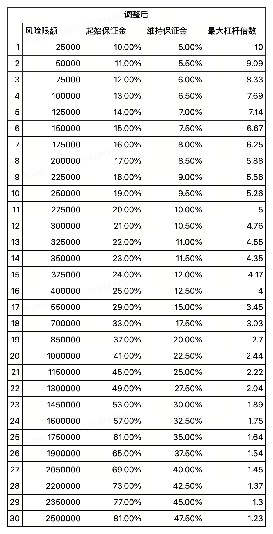 请注意,本次调整自2024年1月13日16:00(UTC+8)开始生效,此前已开仓的仓位杠杆倍数将不受本次调整影响。