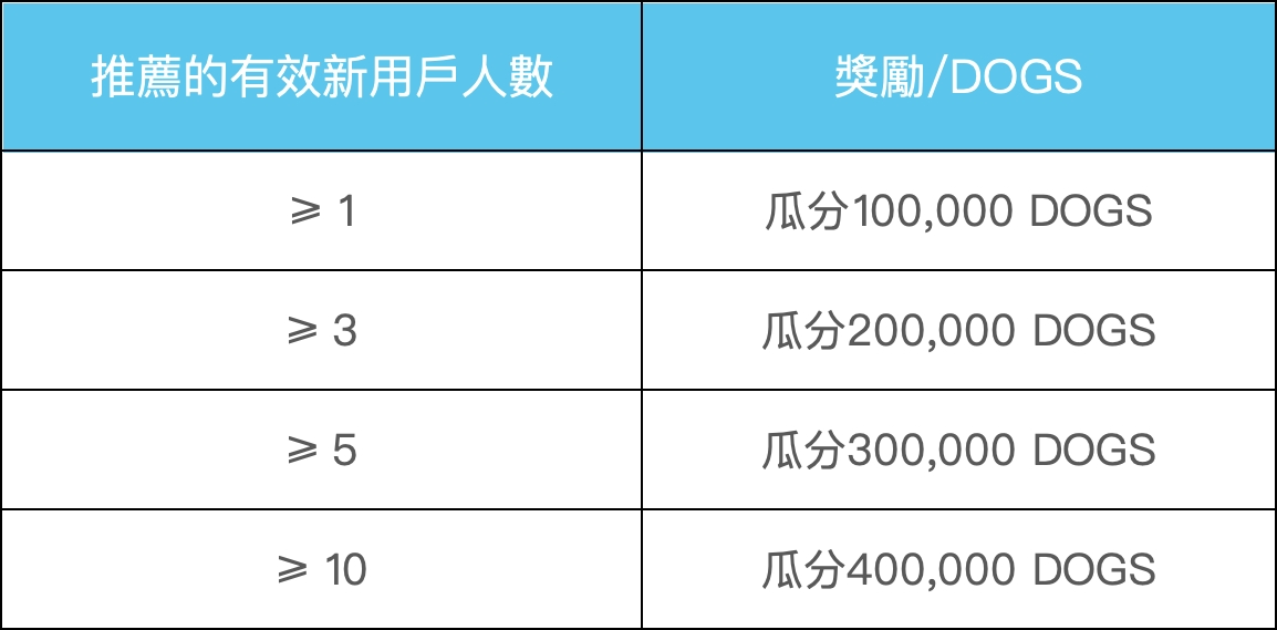 新舊用戶推薦好友完成註冊 + 任意一笔合約交易,推薦人即可獲得對應獎池瓜分福利,有效邀請用戶越多,獲得獎勵越多!總獎池為1,000,000 DOGS!詳情如下: