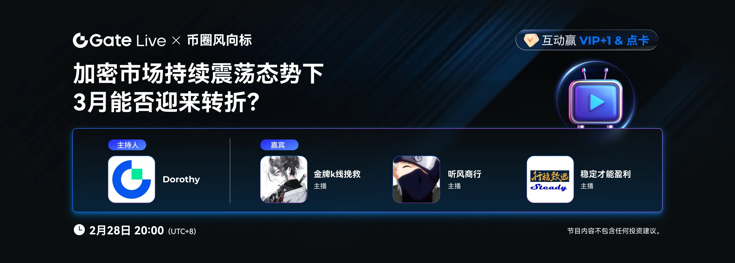 GateLive将于2月28日20:00(UTC+8)举办直播栏目《币圈风向标》。我们将邀请三位平台主播参与其中,共同探讨加密市场持续震荡态势下,3月能否迎来转折。观看直播,直播间免费领空投: