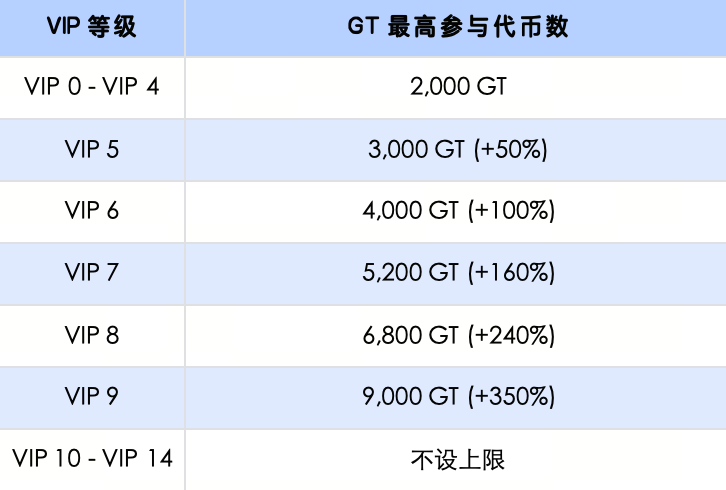 完成身份认证;GT 持仓 ≥ 1 GT,可按照 GT 持仓快照量占比瓜分总奖池。每位 VIP 0 - VIP 4 用户本次活动参与上限为2,000 GT,VIP 10 及以上用户最高可享【不设上限】的参与额度。