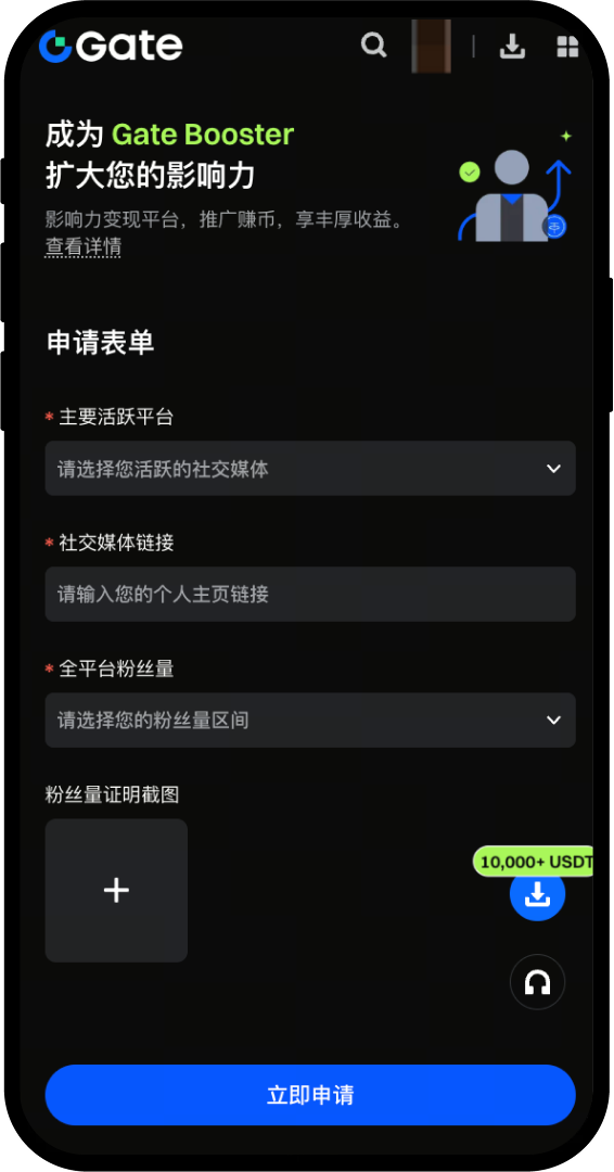 点击左上角头像 -【更多服务】-【活动】- 选择【Gate Booster】,进入页面后点击【立即申请】。根据表单填写相应平台、个人主页链接、粉丝体量、证明截图,并提交申请,平台将在 3 个工作日内完成审核。