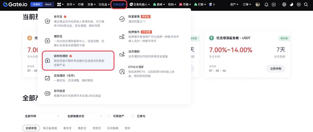 若您是Gate用户,选择登录Gate个人账户;若不是Gate用户,则可以先注册。登录/注册后,点击导航栏【芝麻金融】——【结构性理财】,进入结构性理财页面。