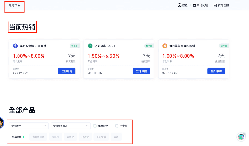 在“理财市场”模块,可以查看“当前热销”、“最新上架”产品排序,并根据“币种”、“销售状态”、“可用资产”、“已参与”、“类型”等信息,按需选择产品,点击【立即申购】,进入产品页面。