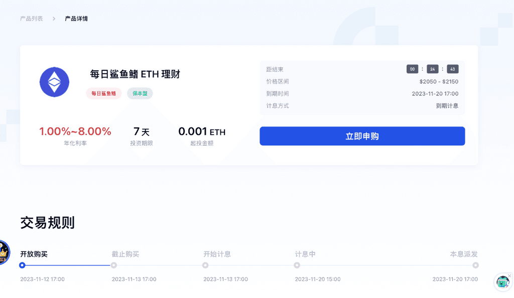在产品详情页面,查看产品交易规则与收益规则,确认无误后,点击【立即申购】。