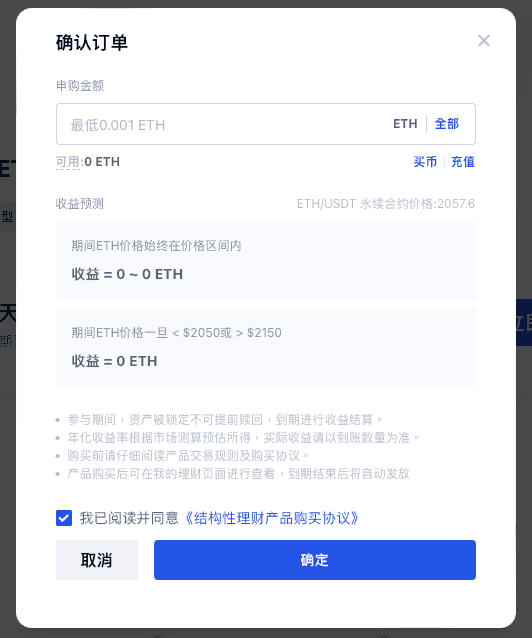 在“确认订单”弹出窗口中输入申购金额,勾选我已阅读并同意《结构性理财产品购买协议》,点击【确定】。