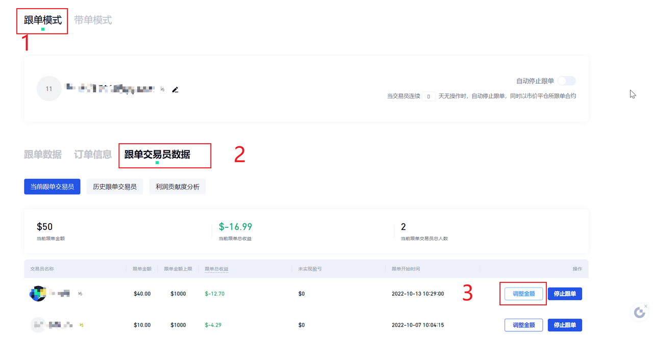 跟单用户可进入“我的实盘”,进入“跟单模式”,点击“跟单交易员数据”,查看“当前跟单”,选择盈利的带单员后点击“调整金额”,转出收益额。