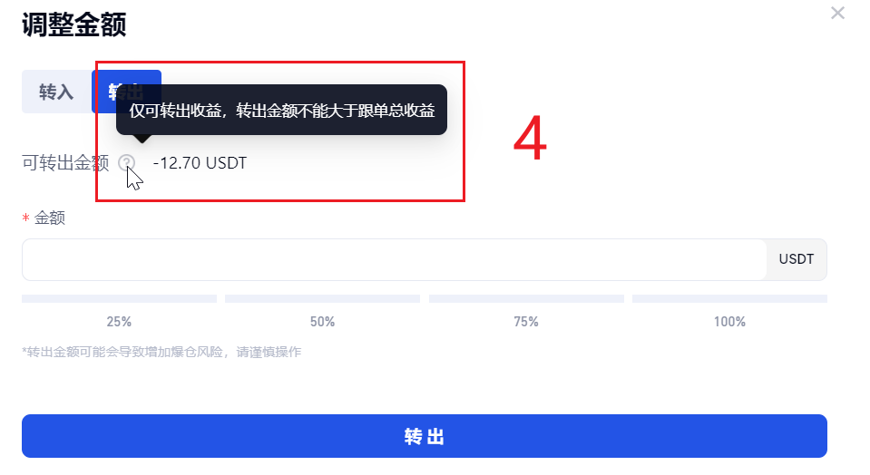 注意:跟单用户需要根据自身实际情况合理设置转出金额,转出金额不能大于跟单总收益。