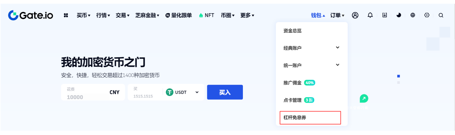 1、登录Gate个人账户,点击页面上方导航栏的 “钱包 - 杠杆免息券”。