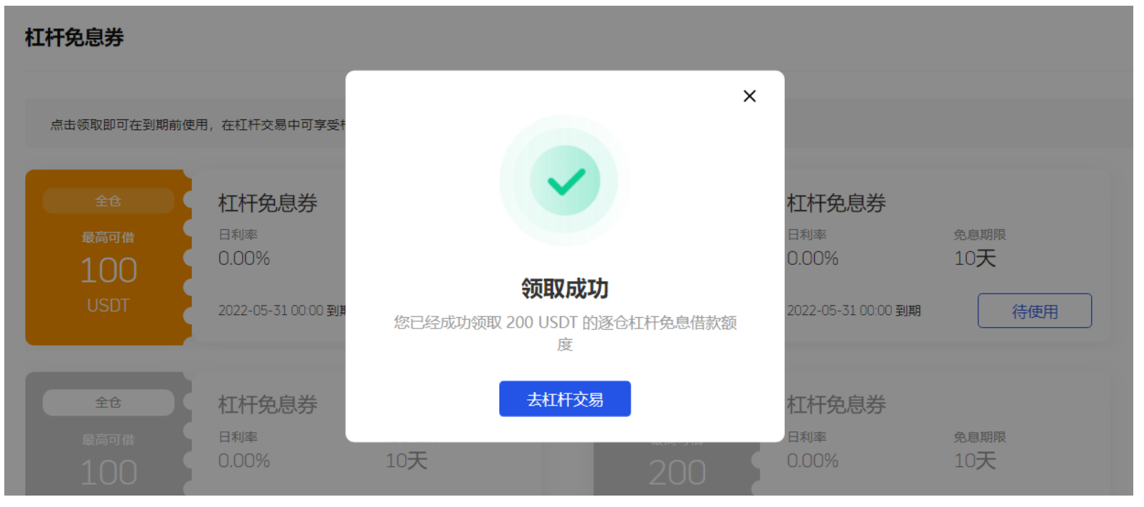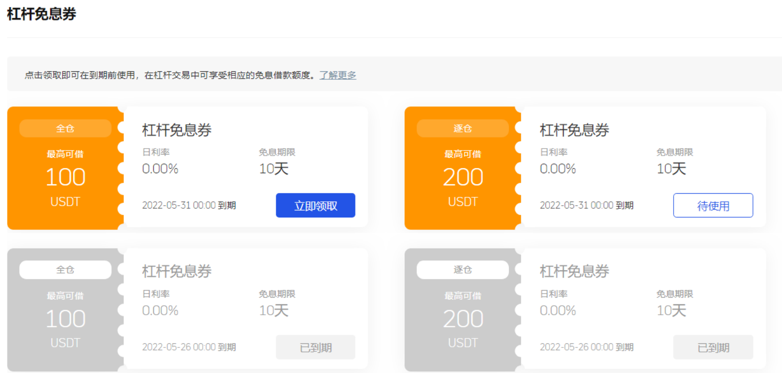3、点击“立即领取”即可领取成功,到期前可在杠杆交易中享受对应的免息借款额度。