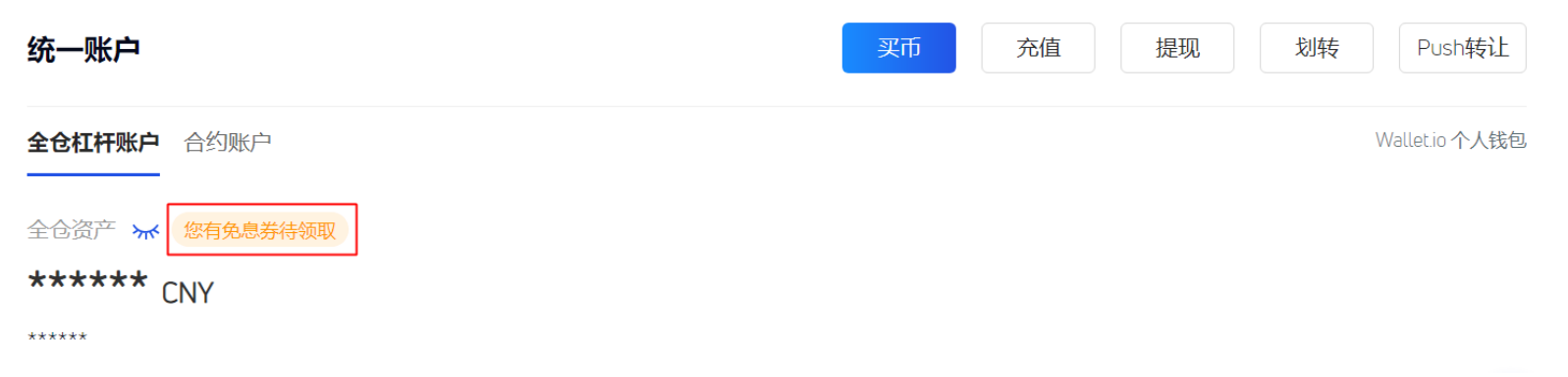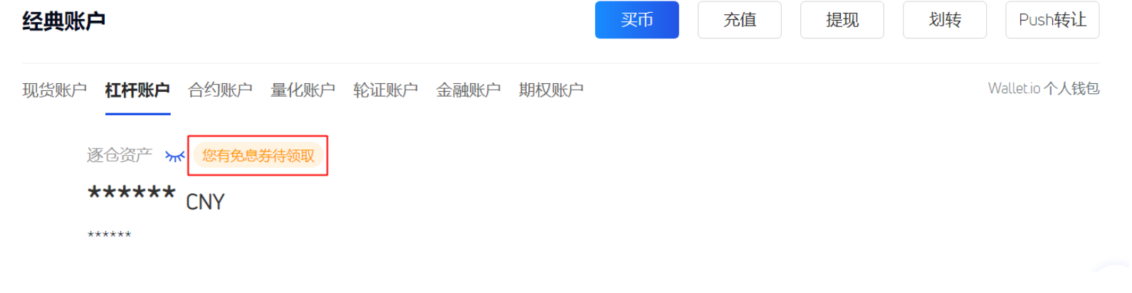 4、如果有未领取的杠杆免息券,杠杆账户中(全仓资产或逐仓资产)会出现对应标识。