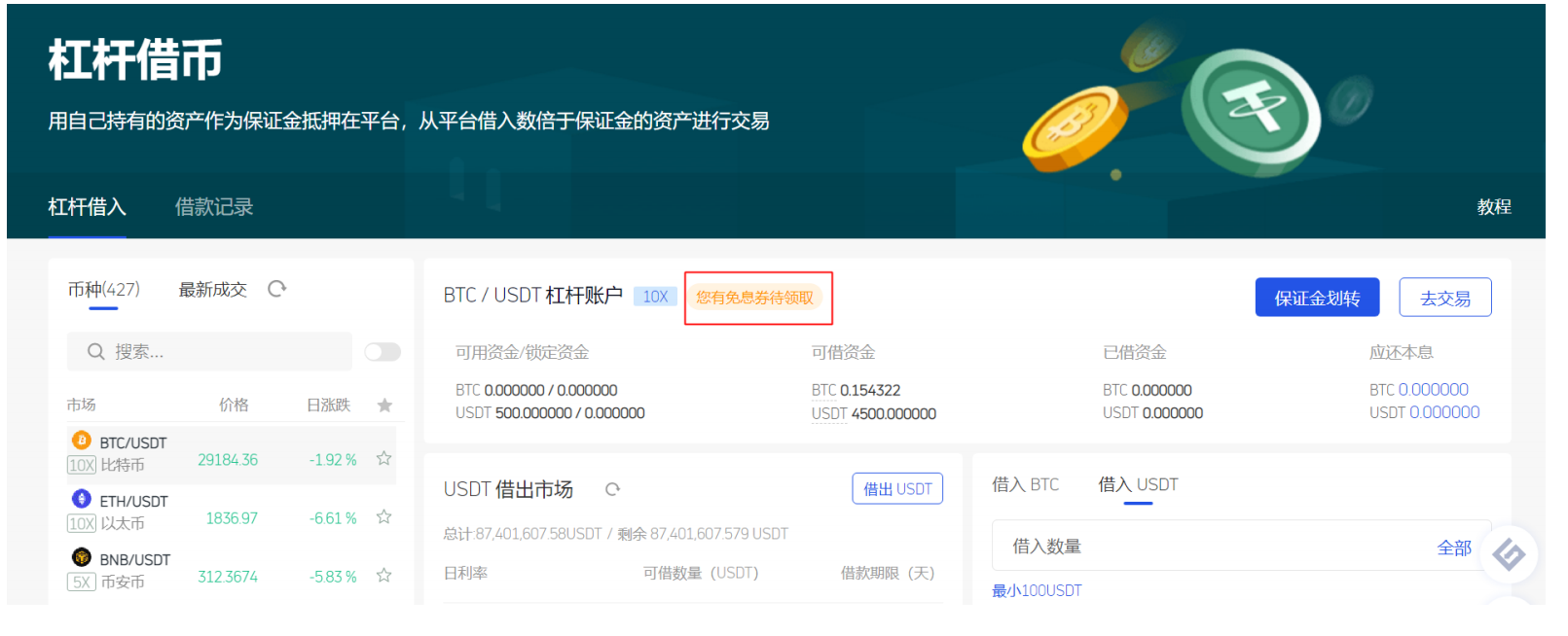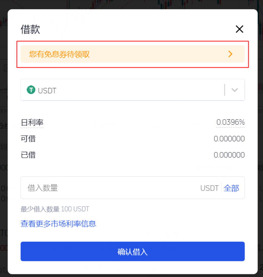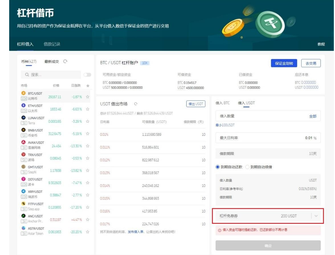 页面。“借入”面板中会默认使用额度最大的免息券,若领取了多张免息券,则可从下拉框中选择任意一张使用。注意免息券须在到期时间前使用,且使用后的券不可再次使用。