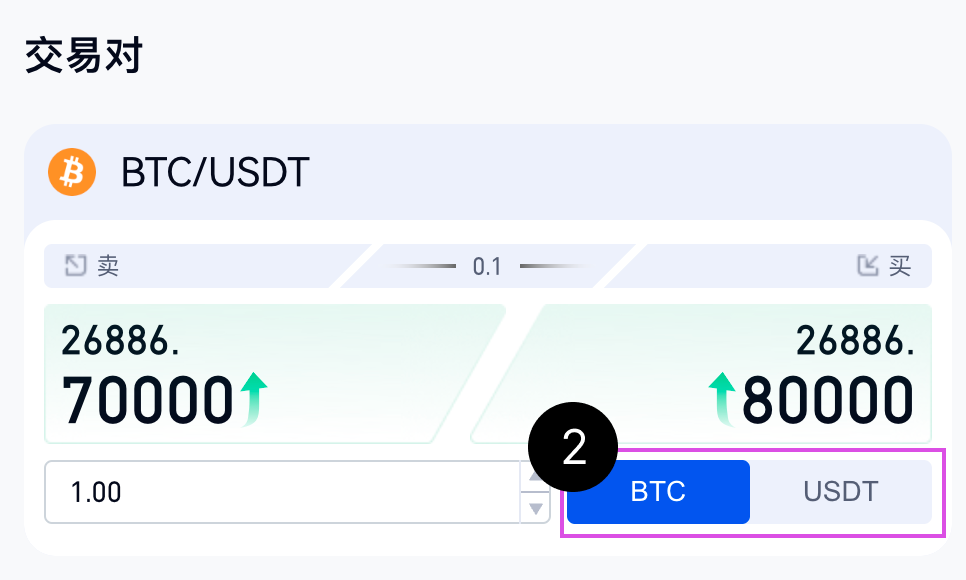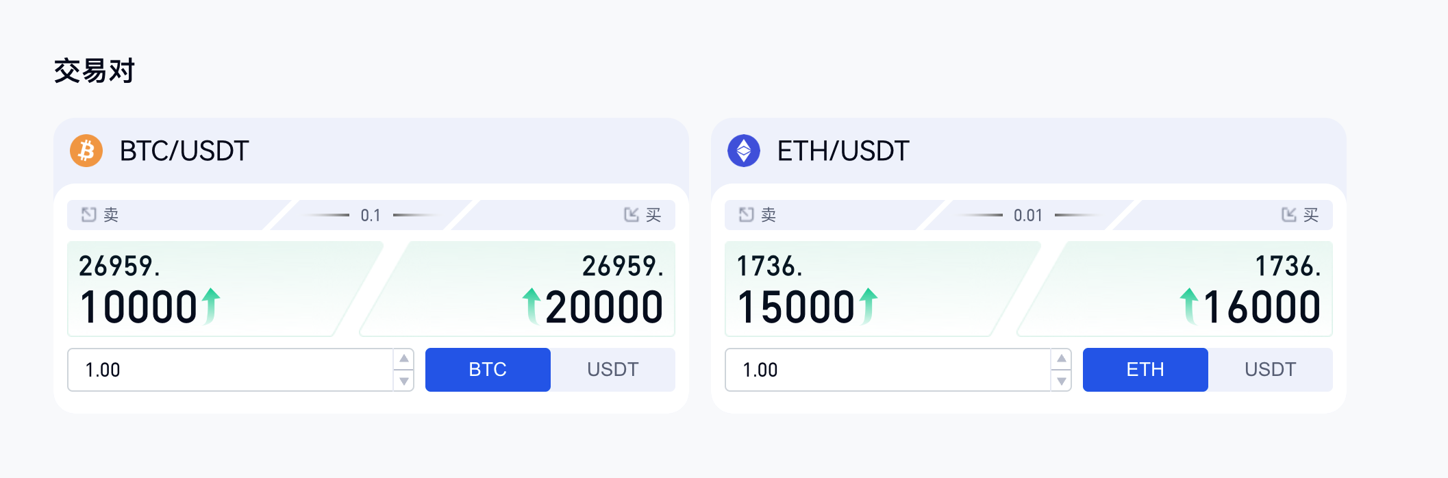 交易对区域展示了当前现货大宗交易所支持买卖币种的报价信息,左侧为当前市场卖价,右侧为当前市场买价,中间数字是当前市场的买卖价差。