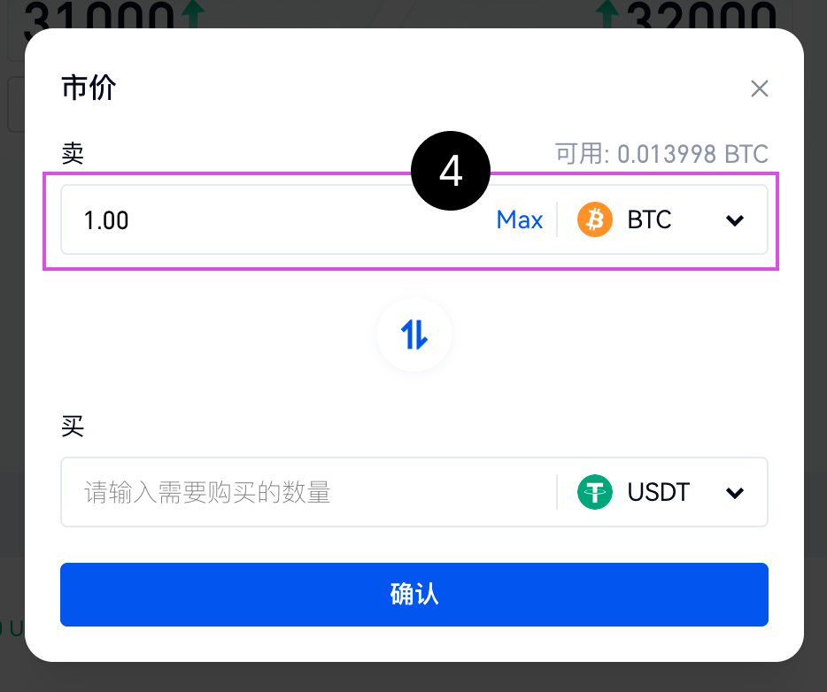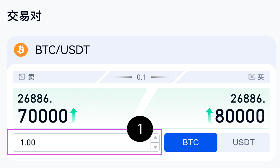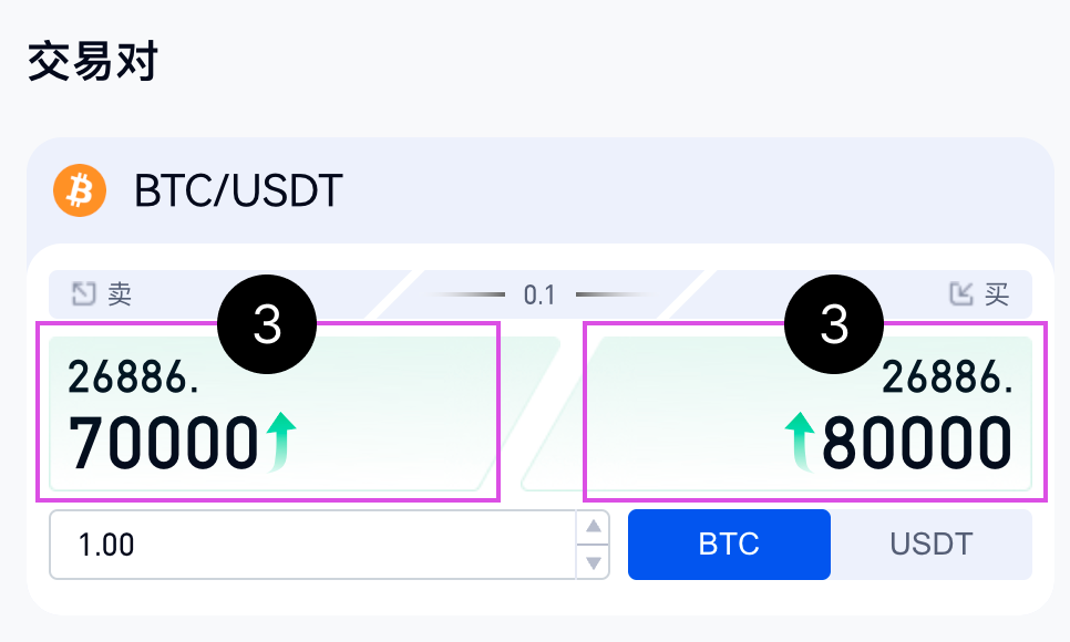 下图BTC/USDT市场,卖价为26959.1USDT,买价为26959.2USDT,买卖价差为0.1USDT