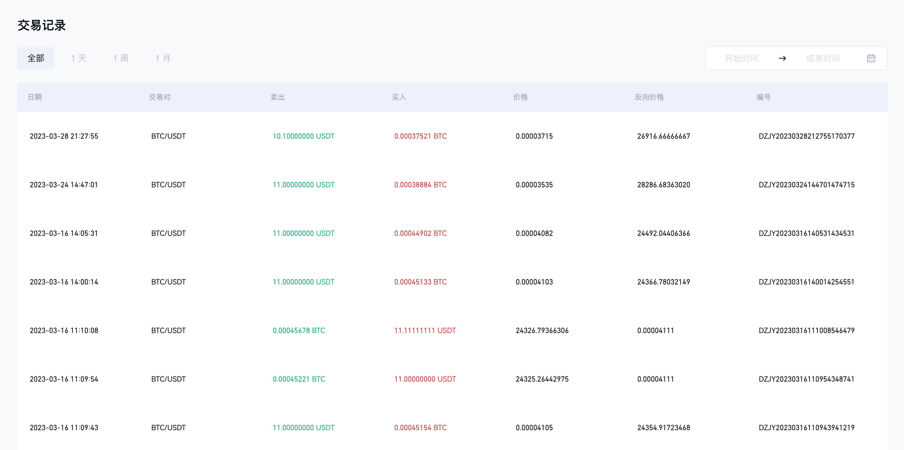 在现货大宗交易面板下方的交易历史模块内,您可以查询到所有交易记录明细,包括交易币对、交易方向及对应币种数量、兑换数量、成交价格和订单编号。
