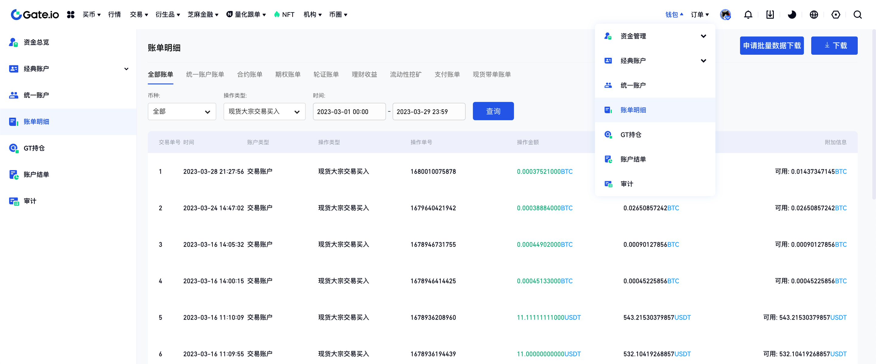 如希望导出交易记录,请访问钱包-账单明细-操作类型选择现货大宗交易,即可下载账单。