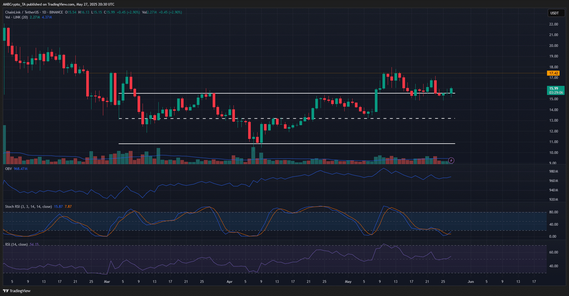 Chainlink (LINK)已于5月8日突破了持续六周的压力位,但随后表现相当平淡。从那时起,LINK的价格维持在旧压力位15.5美元附近。在5月下旬,LINK的价格波动在14.84到18美元之间,未能形成明显的上涨。