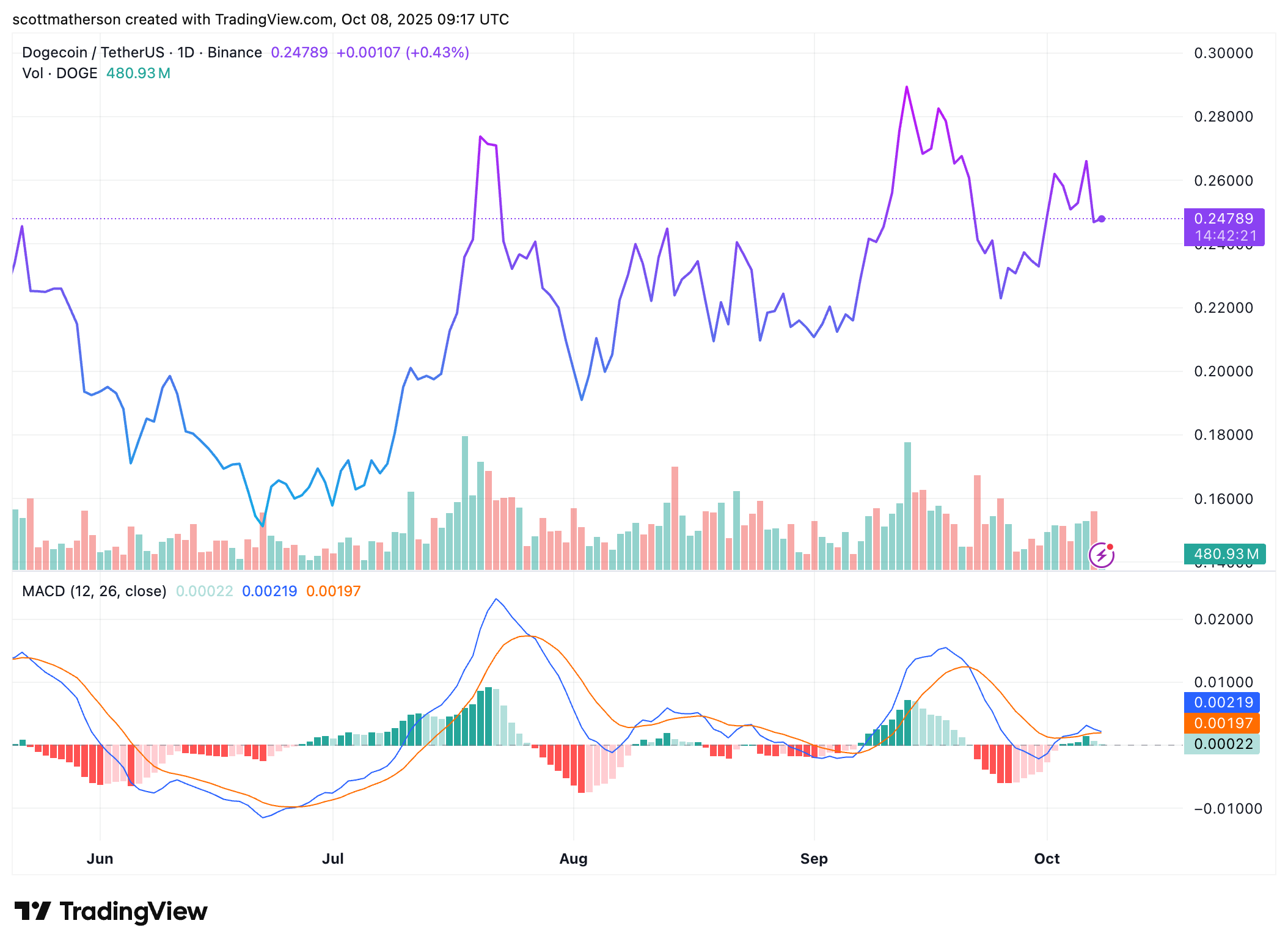 几个月来,狗狗币反复测试$0.25-$0.28的阻力区间,但迄今为止未能突破。加密市场分析师Matt Hughes指出,目前的价格结构显示出在$0.24附近的收窄整合,表明潜在动力正在增加,并暗示这款加密货币可能正在准备向上破位。