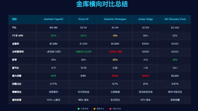 通过对 Hyperliquid 五大顶级金库(AceVault, Growi HF, Systemic Strategies, Amber Ridge, MC Recovery Fund)的深度量化分析,我们得以穿透高额 APR 和总盈利的表象,洞察其策略的核心——并非所有的高收益都“生而平等”。